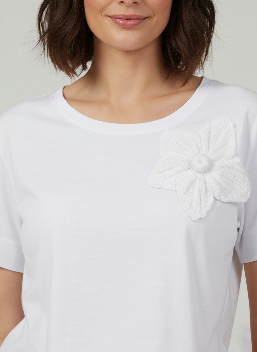 T-shirt decote redondo clássico com linda flor em crochê, puro charme.