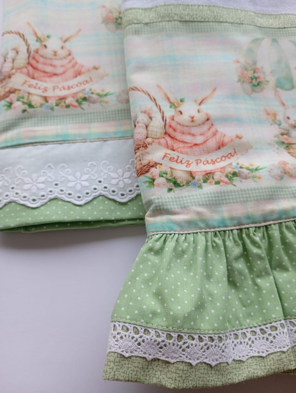 Pano de prato com tema de Páscoa, com detalhes lindos que deixa o ambiente mais bonito e agradável para a comemoração dessa data.