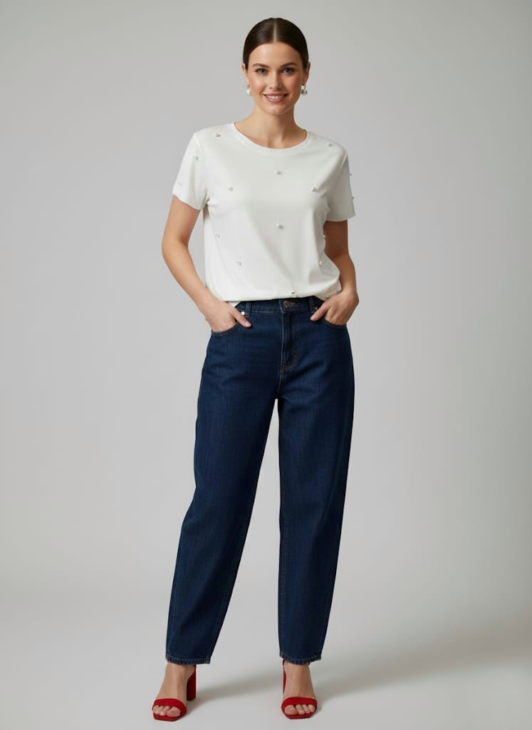 T-shirt decote redondo clássico com bordado de pérolas sortidas, na frente e nas mangas.