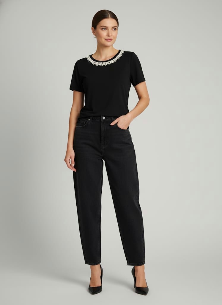Blusa Feminina decote redondo clássico com delicado bordado de pérolas sortidas na gola.