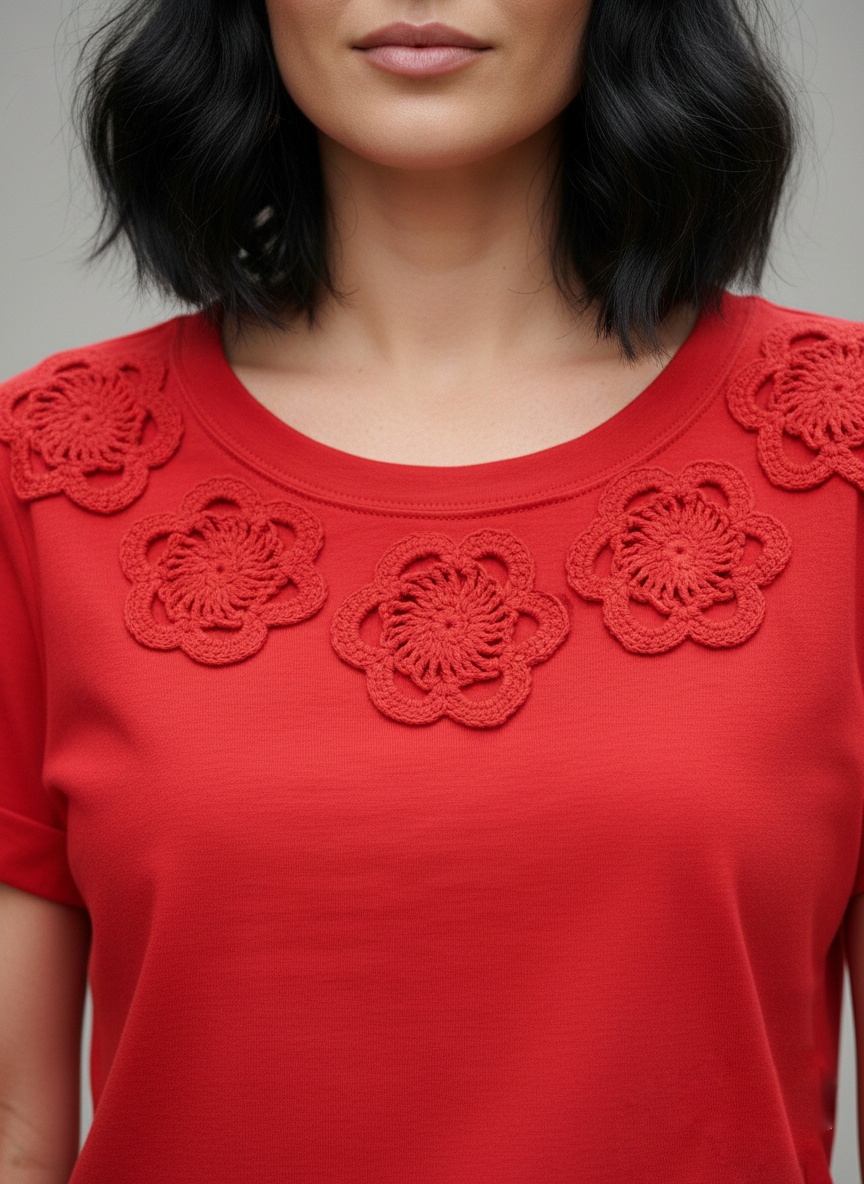 T-shirt decote redondo clássico com linda aplicação de flores em crochê, perfeita.