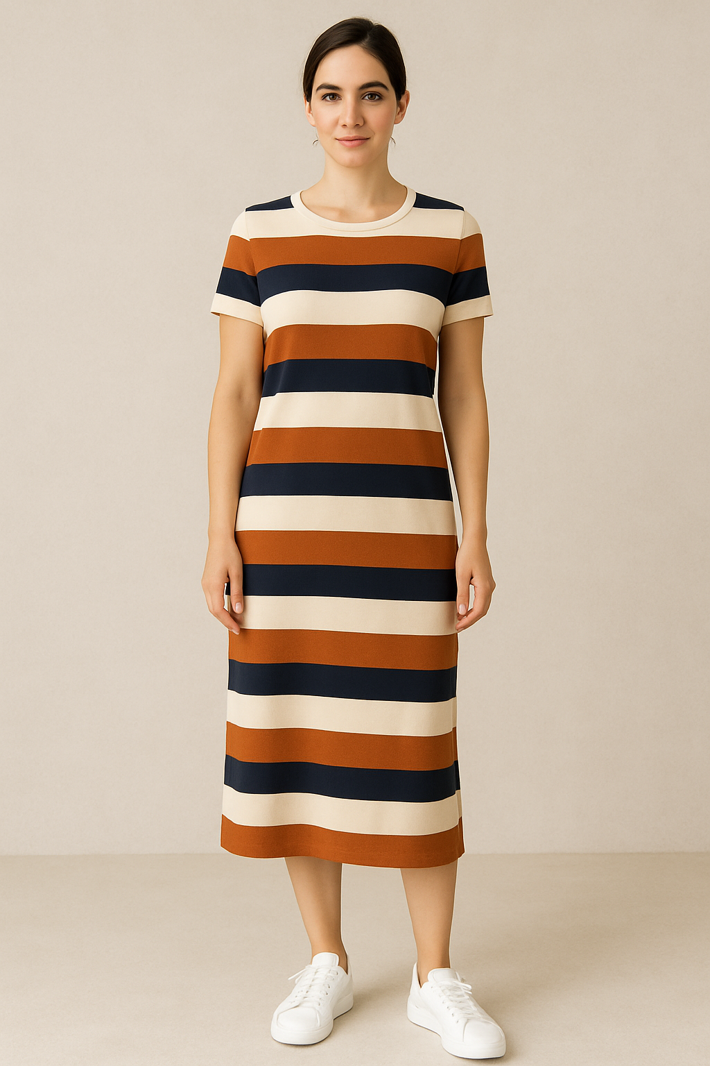 Vestido decote redondo clássico feito na malha mista de viscose e elastano, com toque suave, modelo clássico com fendas laterais.